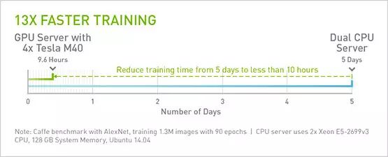 实验数据显示,配备4块Tesla M40 GPU的服务器比双路E5-2697 v3的CPU服务器在运行Caffe进行训练时加速13倍,可让数据科学家在训练自己的深度神经网络时能够节省数天乃至数周的时间。