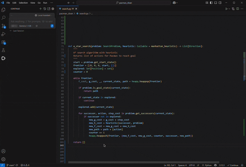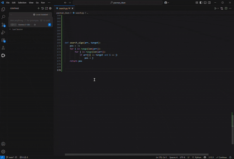 Continue.dev 在一台搭载 GeForce RTX 的 PC 上运行,与 Gemma 12B Code LLM 配合使用,帮助解释现有代码、探索搜索算法和调试问题 — 全部都在本地完成。该助手就像一个虚拟助教,提供通俗易懂的指导、上下文感知的解释、行内注释以及针对用户项目量身定制的代码改进建议。