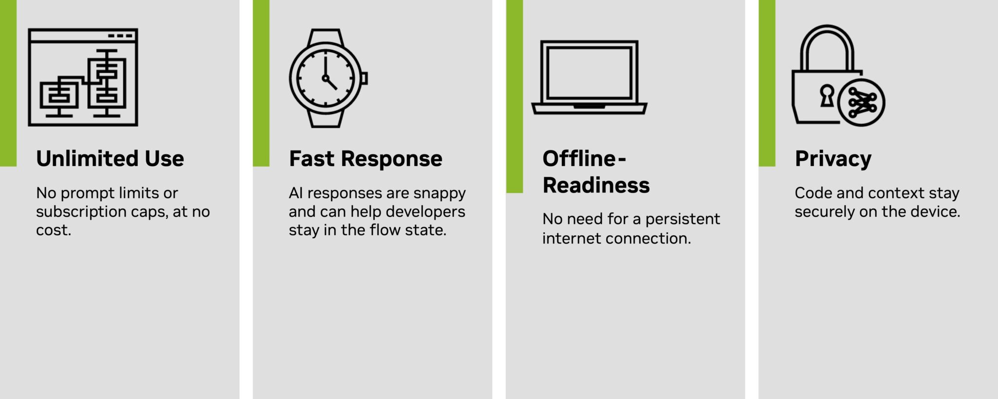 这种响应速度归功于 GPU 加速。Gemma 12B 这样的模型对计算的需求很高,特别是处理长提示词或跨多个文件工作时。在没有 GPU 的情况下,在本地运行这些模型可能会感觉很慢,即使是简单的任务也是如此。有了 RTX GPU,Tensor Core 直接在设备上加速推理,因此助手速度快、响应灵敏,能够跟上即时的开发工作流。