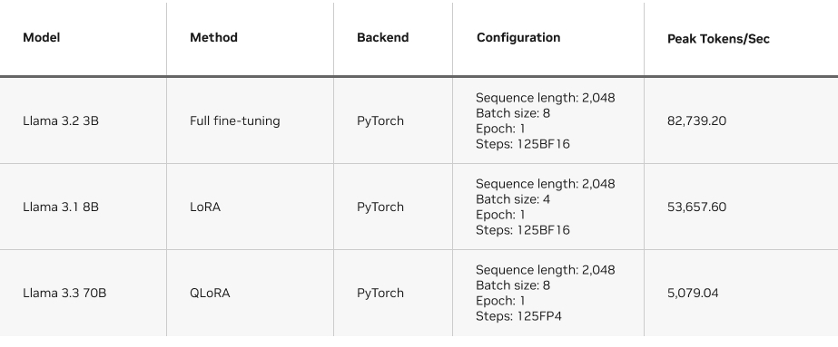 下表展示了在 DGX Spark 上对 Llama 系列模型进行微调的性能表现。